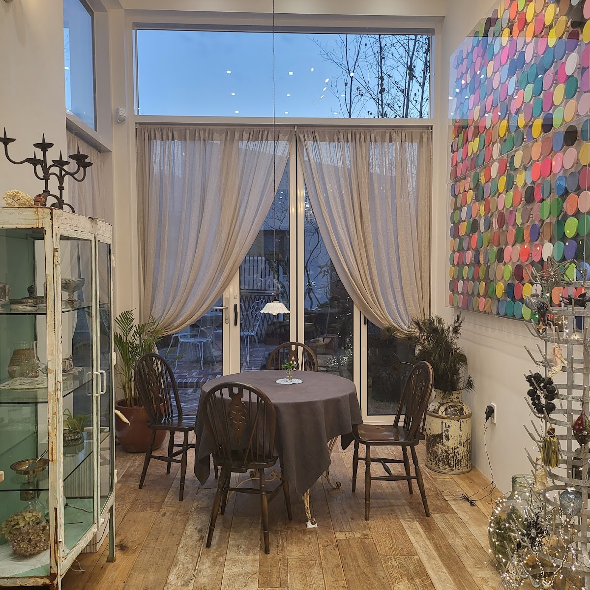 As you approach the café, the enchanting exterior beckons you inside with its charming façade. Once you step in, you're greeted by a beautifully eclectic interior that feels like a warm embrace—a delicate blend of antique and contemporary styles. The ambiance is akin to wandering through a cozy gallery, with artfully displayed decorations that create a truly inviting atmosphere.